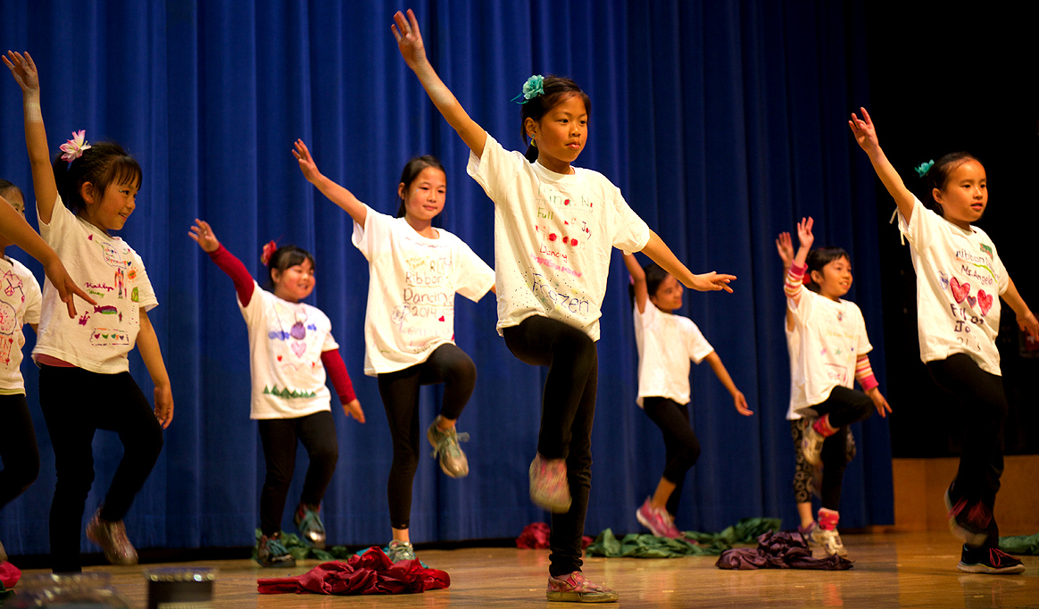 Photo: Patrick Mckinnie – Fourth and fifth graders from the Robert Louis Stevenson ribbon dancers show the crowd their brightly colored ribbons during their live performance.