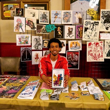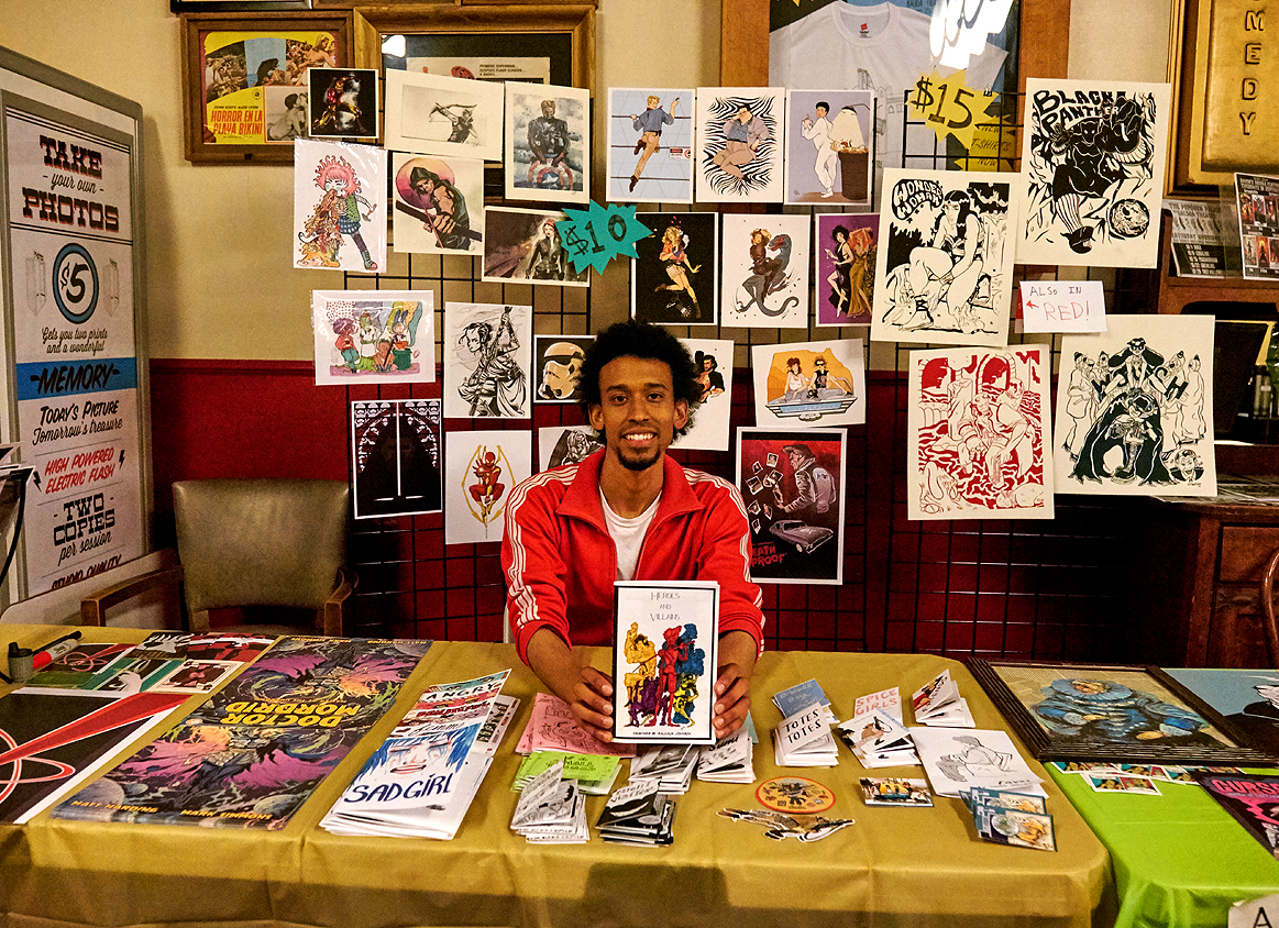 Photo: Patrick McKinnie Malcolm Johnson, one of the organizers of the inaugural Balboa-Con in the Outer Richmond District, sits in front of a comic art table set up in the lobby of the Balboa Theater. The 90-year-old theater hosted the event over several days.