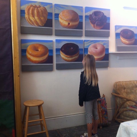 His nearly daily ritual of stopping by All Star Donuts on the way to his studio has resulted in numerous still life paintings devoted to the donut, including a series bought by Genentech in 2015. Many have a majestic quality, with the ocean as a backdrop. They are as appealing as pop artist Wayne Thiebaud’s eye candy.
