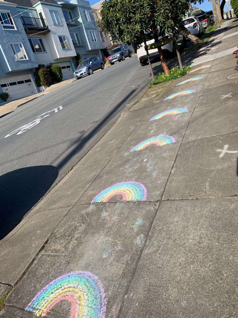 Thought you might enjoy these visuals. I started drawing rainbows on the sidewalk yesterday morning, and after a while a neighbor’s daughter joined the effort. The south side of Seal Rock between El Camino and Alta Mar is full up with them now!