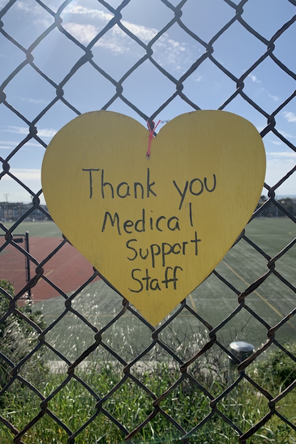 At Ulloa Elementary School, a tall fence overlooks the empty soccer fields. It is impossible not to think of the kids who would give anything to be back at recess (and their parents who could probably use a recess, too). Look up, though; there’s a row of painted wooden hearts hanging on the fence. Each heart has a handwritten note of gratitude and encouragement for those who need it: the school’s graduating class of fifth graders, Cesar the mailman, healthcare workers, grocery store clerks, and the face of the nation’s medical community, Dr. Anthony Fauci himself.