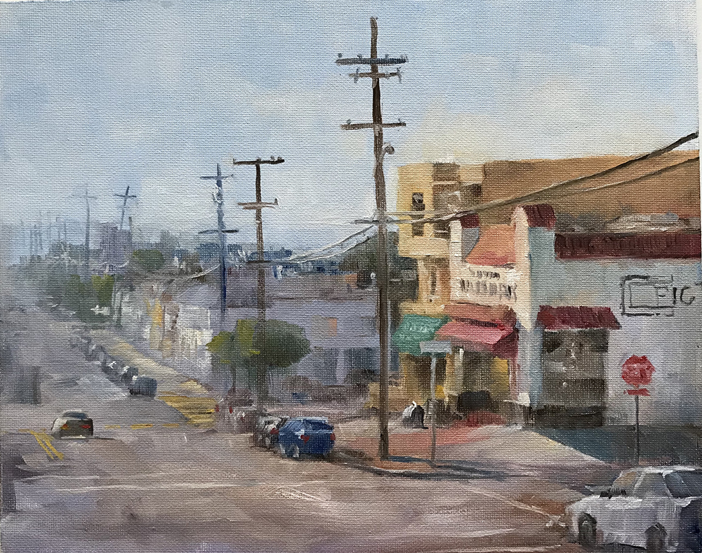 “I don’t want to over-communicate. I just want to hint at it. I like this direction. It may not be the most popular. A lot of people want something recognizable. I’m going toward the moody, the atmospheric. I don’t want to paint postcards. I like giving some alley in the Sunset some attention and things that are overlooked.