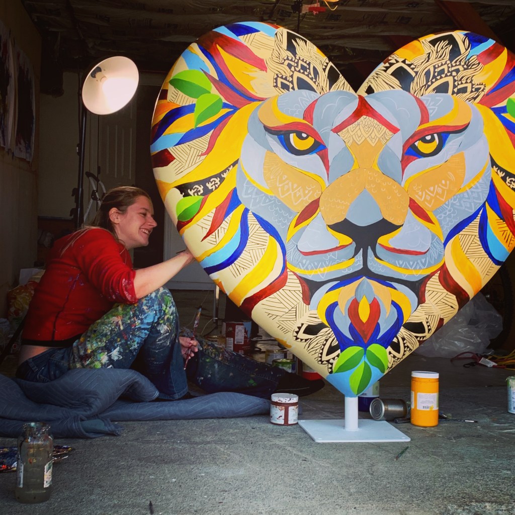 After painting two large ceramic hearts for San Francisco General Hospital, Entropy was commissioned by the East Bay city of Danville to paint a new one, but due to COVID-19 the piece has been sitting idle in her garage. It depicts a lion on one side and an oak tree on the other, honoring the brave pioneers who started a farming community there in 1891, and the 350-year-old oak tree at the town’s center.