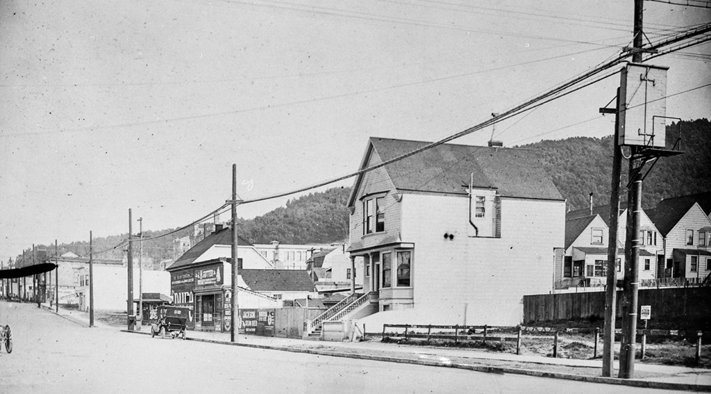 Looking east toward Ninth Avenue in 1910, Irving Street was lined with private residences and a few scattered shops. Beyond this burgeoning corridor you can see the Affiliated Colleges peeking out from the forested peaks of Mt. Sutro. That is UCSF’s Parnassus Campus today. Photo courtesy of a private collector/Western Neighborhoods Project/OpenSFHistory.