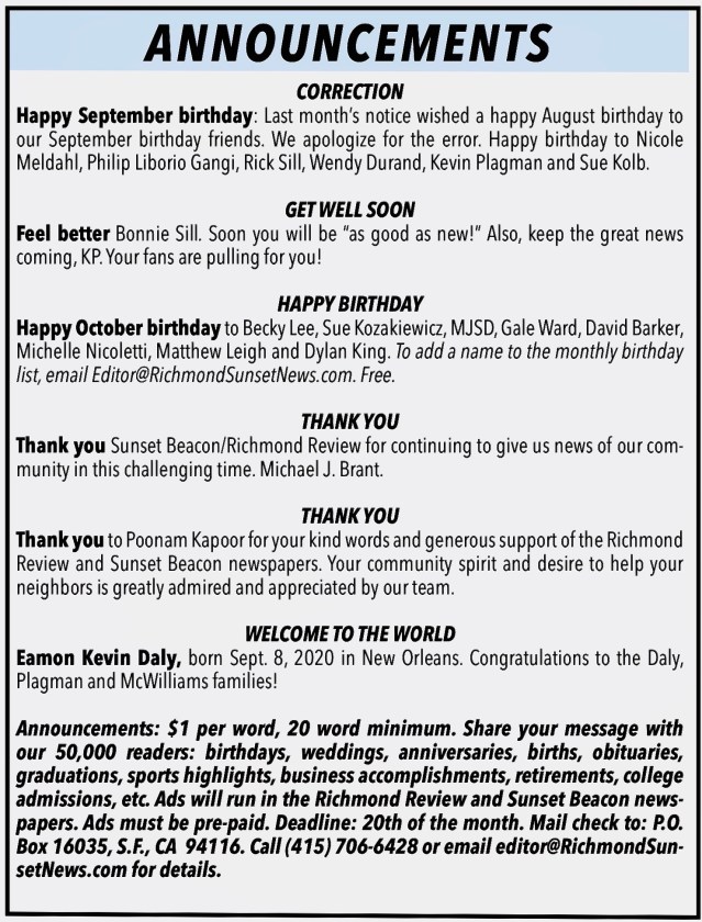 Call 415-706-6428 for information about advertising online and in the printed versions of the Richmond Review and the Sunset Beacon newspapers. Or email us at Editor@RichmondSunsetNews.com.
