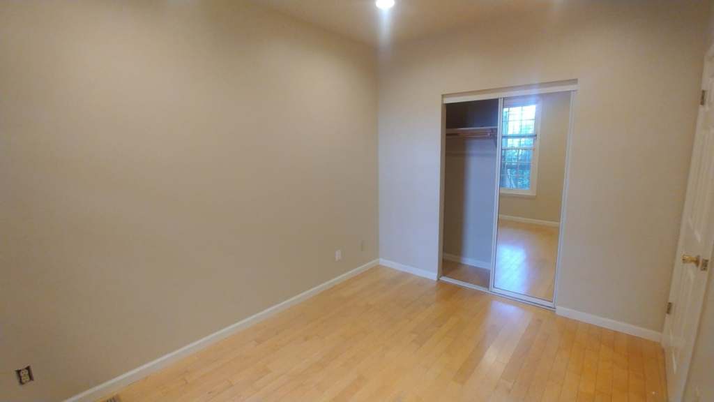 Smaller bedroom with east window, ample closet space — bathroom next door (shared use with one other bedroom) with bathtub, shower, bidet attachment in toilet. $1050
