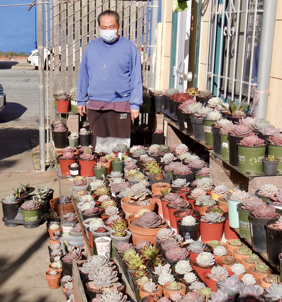 Wayne Chan stands in his back yard along with hundreds of potted succulents which he uses for his streetside display. He created a landscaping work of art around his home on the corner of Wawona Street and 38th Avenue. Photos by Michael Durand.