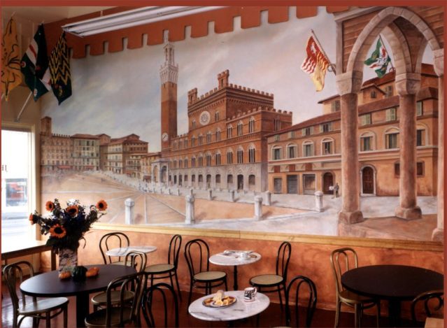 “The story of the cafe mural begins with a client who loved Siena, Italy, and would visit there annually,” Jennifer wrote in an email. “She was a passionate Italophile and had a vision for her new cafe at 24th and Taraval in 1995. The large wall was ideal to hold a mural.”