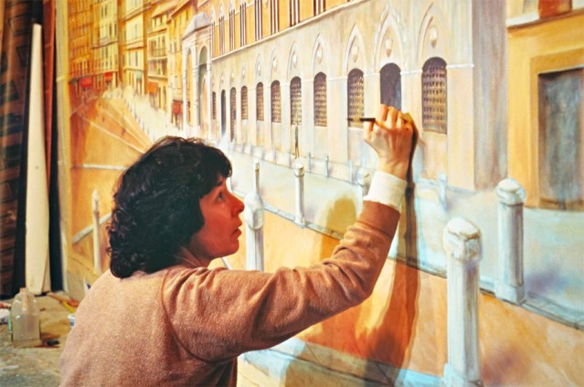 When I first viewed the large mural in the late 1990s, its representational, almost photographic detail of the Piazza del Campo with its Italian medieval architecture and Gothic overtones, was matched only by its immense beauty. The mural’s soft harmonious pastels, even-tonal values, fine geometric lines and angled composition move the viewer’s attention effortlessly across the expansive image.