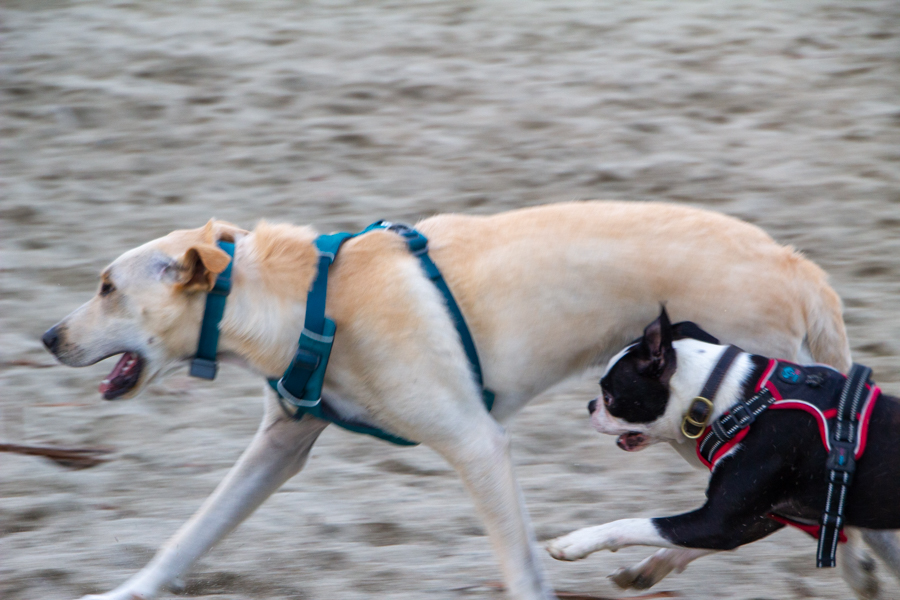 The black terrier Sherlock chases another dog in play.