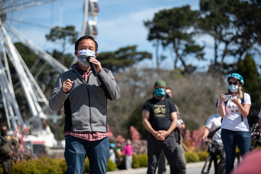 California Assemblymember David Chiu spoke to the crowd at the rally, arguing that without car-free JFK he would not feel safe visiting with his son Lucas from their Bayview home.