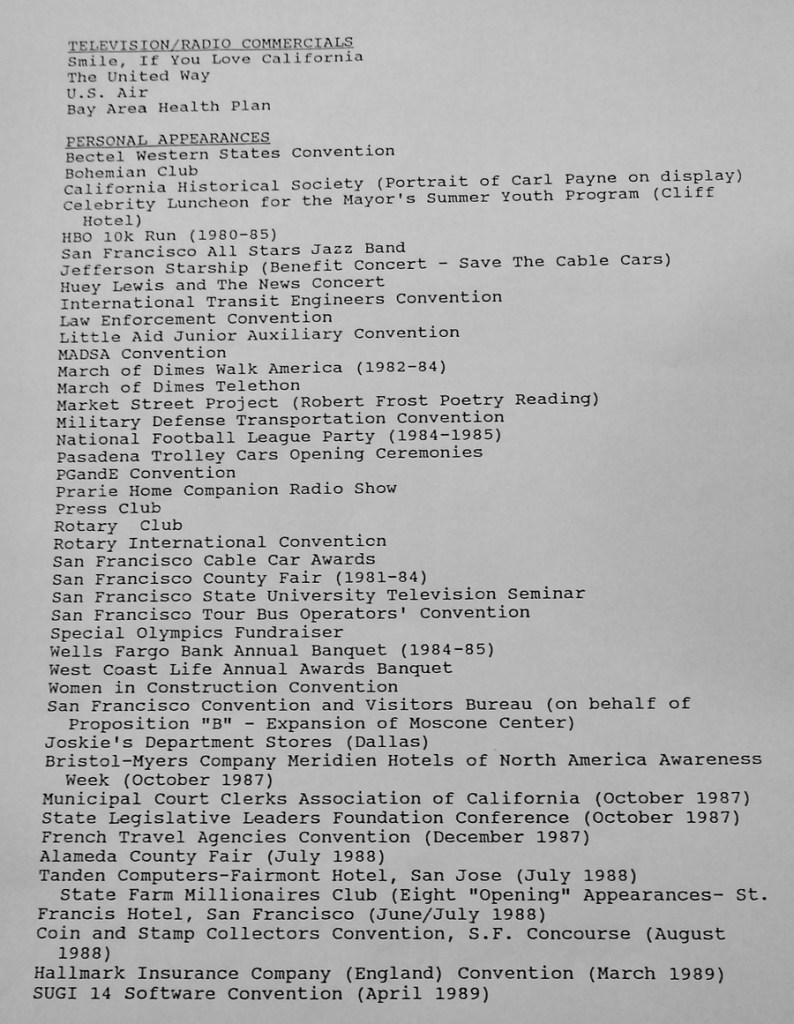 Click link for YouTube videos of some of Payne’s performances. For other stories, Google “Carl Payne cable car.”