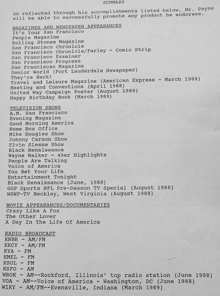 Payne was stationed in Japan for two years as a military policeman. He was discharged from the Marines at a Naval base on Treasure Island and has been in the Bay Area ever since.