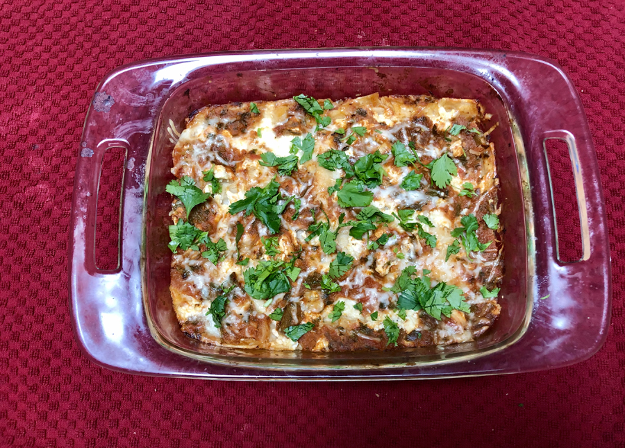 Chilaquiles is a Mexican dish that can use dry, old tortillas and other available ingredients. The entrée can take a number of forms, such as a soup with tortillas floating or a hearty casserole dish. The sauce used in this recipe can be made with tomatoes or tomatillos (green Mexican tomatoes with husk). In addition to tortilla strips, the sauce and cheese, the casserole can be layered with beans or tofu and/or rice. It is a humble dish with modest ingredients which can make a substantial part of a meal for a large group. Ideal for a pot luck or a picnic!