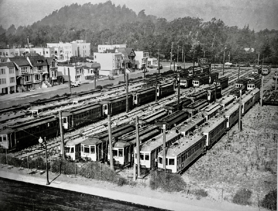Elevated view looking north over a Market Street Railway boneyard bounded by homes on 14th Avenue and Golden Gate Park seen beyond Lincoln Way in the distance, circa 1940. This is where the Park West Apartments and Andronico’s are now. Photo courtesy of a private collector/Western Neighborhoods Project/OpenSFHistory.