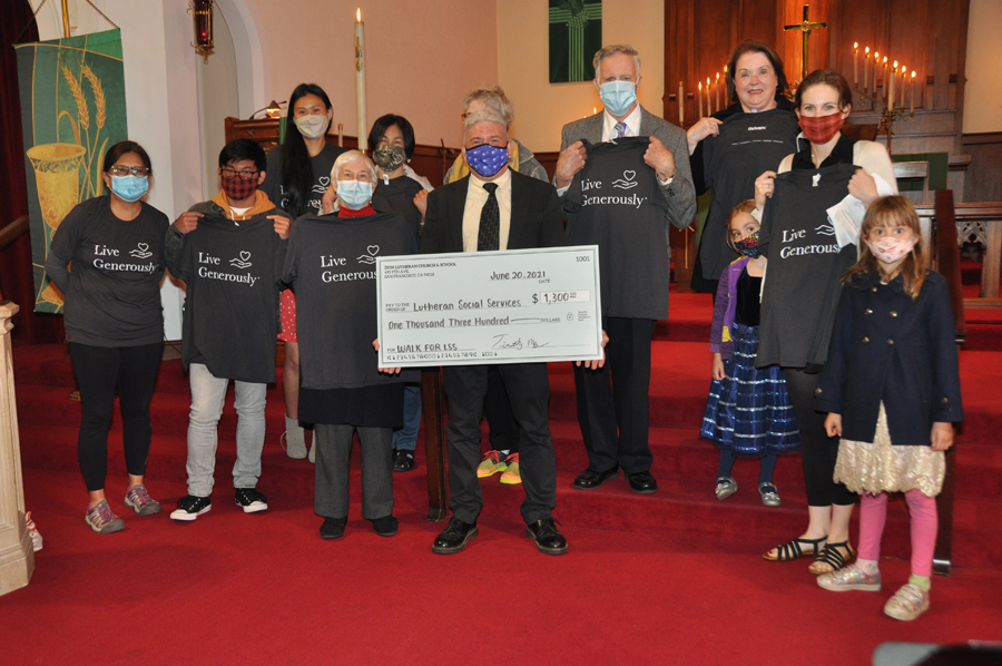 Jerry Metzger, development director for Lutheran Social Services of Northern California, received a gift of $1,300 on June 20. The money was raised as a challenge to members and friends of Zion Lutheran Church to walk 2,000 miles for which the church would donate $1,000. An additional $300 was raised in monetary donations. Walkers received “Live Generously” T-shirts from Thrivent, a member-owned financial services company that supports local volunteer Action Teams through seed funding.