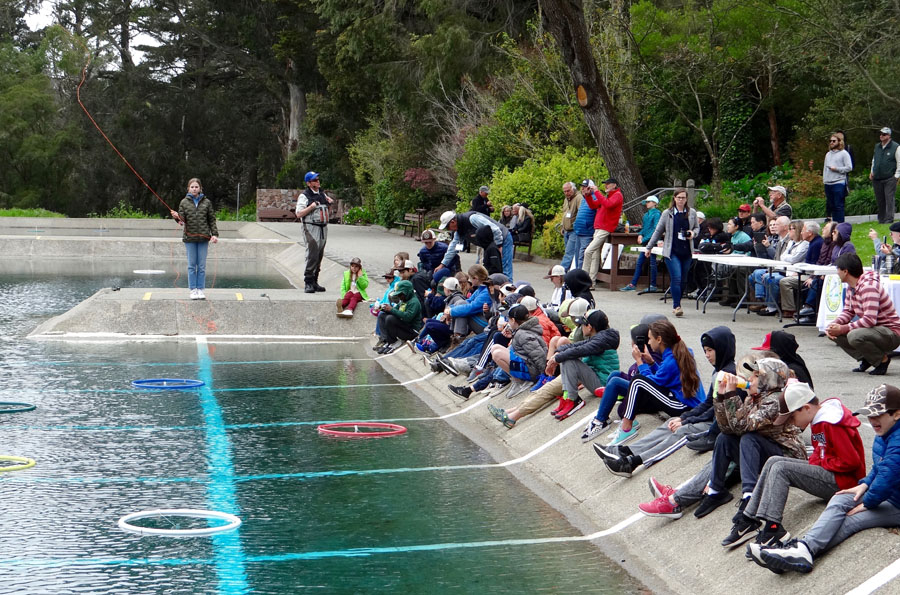 On George Washington’s birthday, February 22, 1938, the San Francisco Examiner reported exhibition casting being held at the new pools, advising readers to watch and talk to experienced casters for advice in advance of the approaching fishing season. They displayed different techniques used to cast while aiming at a specific target, versus trying to cast as far as possible.