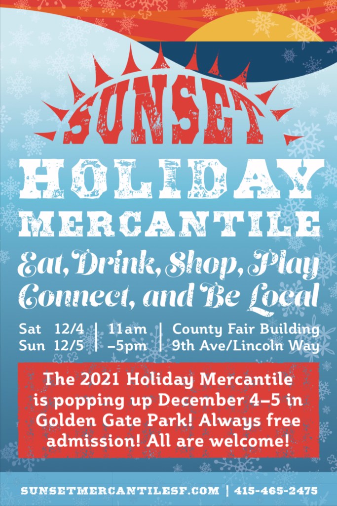 Come Eat, Drink, Shop, Play, Connect and Be Local December 4th-5th, 11 am-5 pm at the SF County Fair Building (9th Ave/Lincoln) in Golden Gate Park at our 6th Annual Sunset Holiday Mercantile featuring TWO DAYS of local makers, merchants, artists, food artisans, food trucks, oodles of children’s activities, live music, community causes, beer and wine tasting by Seven Stills, Sunset Reservoir and Siena wines plus so much more!