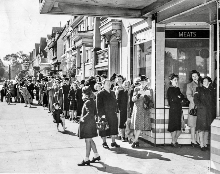 Long lines mirroring pandemic times at Denhard’s Market at 701 10th Avenue near Cabrillo Street. This photo was taken on March 1, 1943, the beginning of World War II’s “Ration Book Two” which added more restricted items and a new set of stamps to match the purchase. Photo courtesy of a private collector/Western Neighborhoods Project/OpenSFHistory.