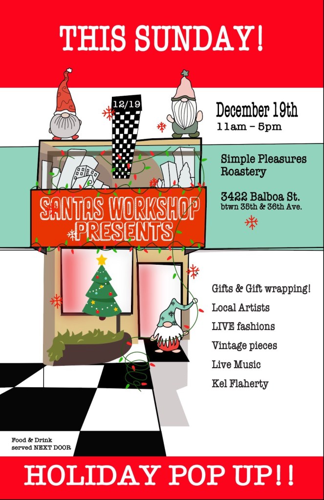 Additionally, Ahmed’s generous donation to Simple Pleasures Coffee Roastery for this event made it possible for the Westside of SF to shop locally, enabling artists and neighbors to mingle with one another in support of our local artists. This pop-up holiday event may just inspire other artists who live in the Richmond to display their talents at future events.