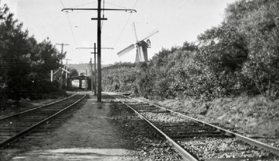 Once upon a time, a streetcar ran through Golden Gate Park. The photographer was standing on the tracks looking north toward what is now the JFK Drive overpass and the Dutch Windmill. The route began as a steam train, was electrified in 1898, and converted to a conventional streetcar line by 1902. The 7-line streetcar was discontinued in 1947 (about when this photo was taken) but you can retrace the tracks by walking along Railroad Trail behind the Beach Chalet. Photo courtesy of a private collector/Western Neighborhoods Project/OpenSFHistory.