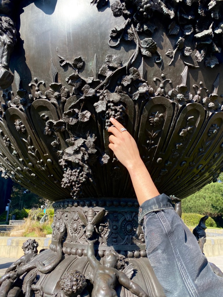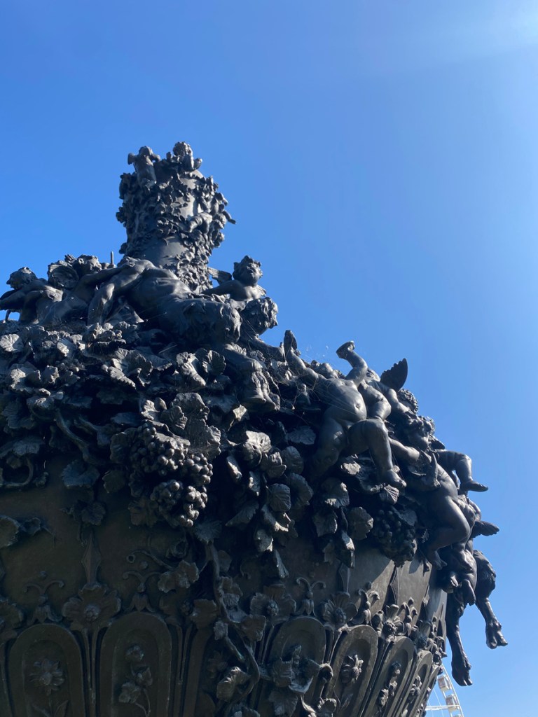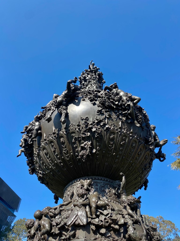 Sculptor Gustave Doré drew on ideas from French wine and Greco-Roman mythology for the various figures all around the bronze vase, named Poème de la Vigne (Poem of the Vine) which weighs almost three tons, according to the de Young Museum’s website. The bottom of the roughly 11-foot-tall vase features bugs, referring to the literal pests that devoured grape crops during Doré’s 19th century, a time before modern pesticides, according to Paul Lang, the National Gallery of Canada’s chief curator.