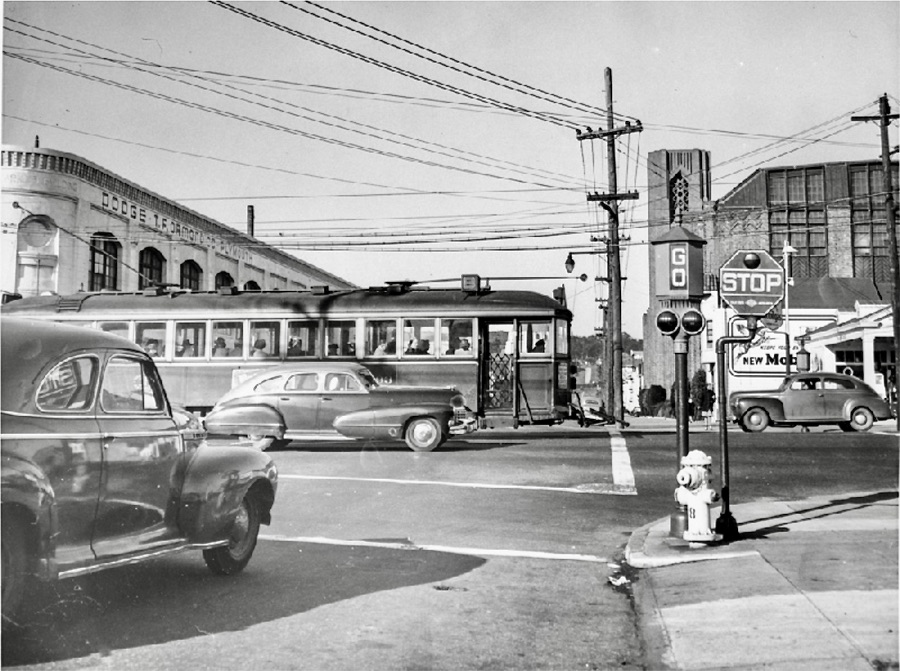 Below: The view north across Geary Boulevard from Arguello Boulevard, January 1947. The Larkins Building (the former Park and Ocean Railroad Co. Geary Street Carbarn), with signage for T.F. Ormand Dodge and Plymouth dealer at left, Roosevelt Junior High School at right. Auto traffic and a Municipal Railway (Muni) B-Geary streetcar can be seen crossing the intersection. Notice the birdcage traffic signal. Photo courtesy of a private collector/Western Neighborhoods Project/OpenSFHistory.
