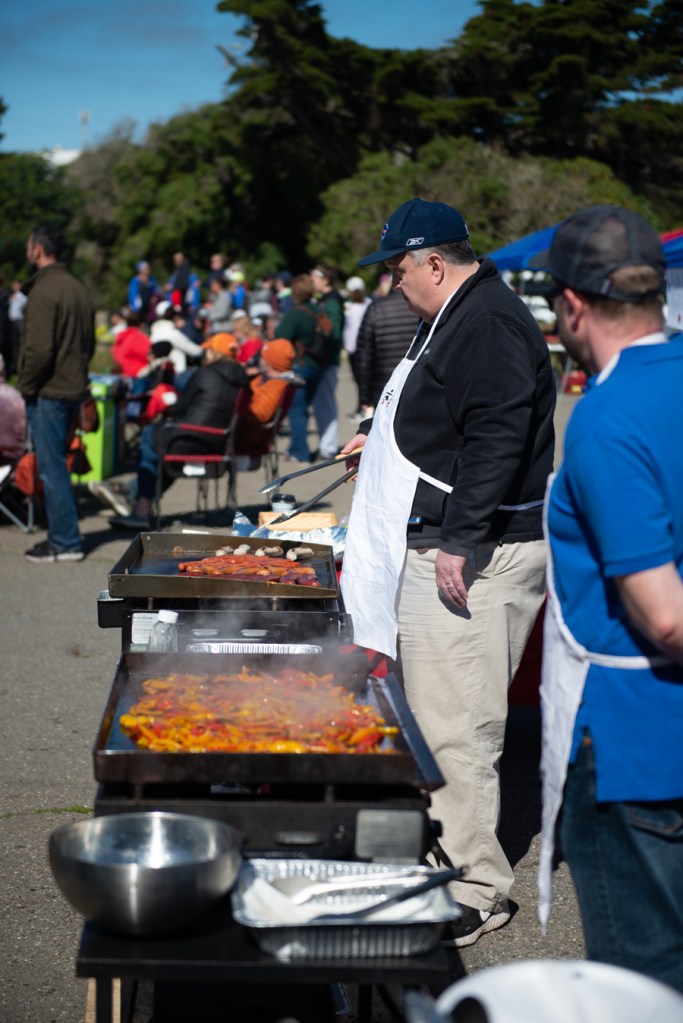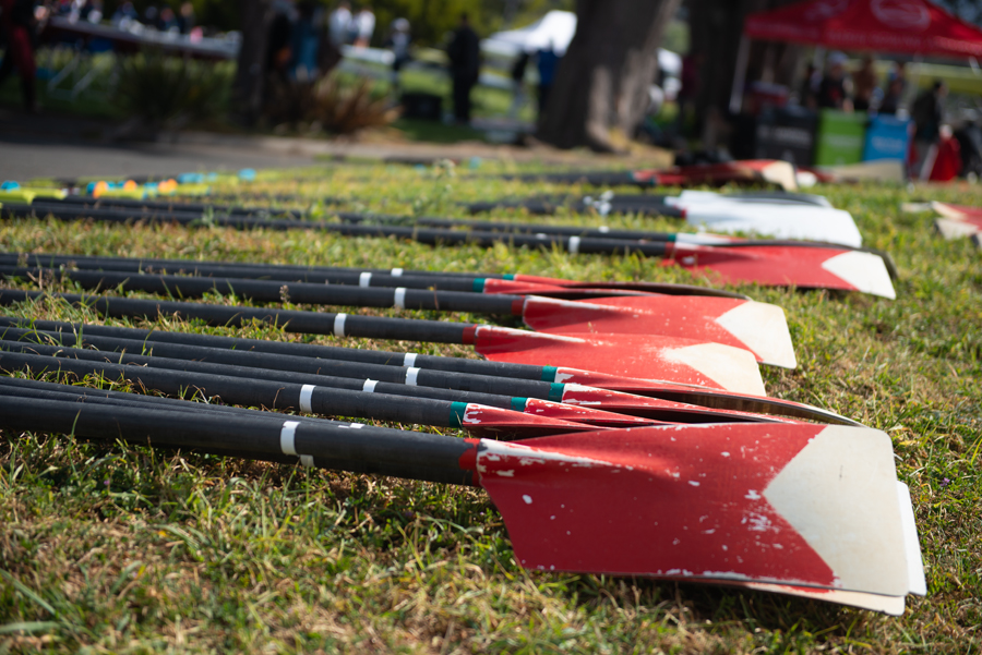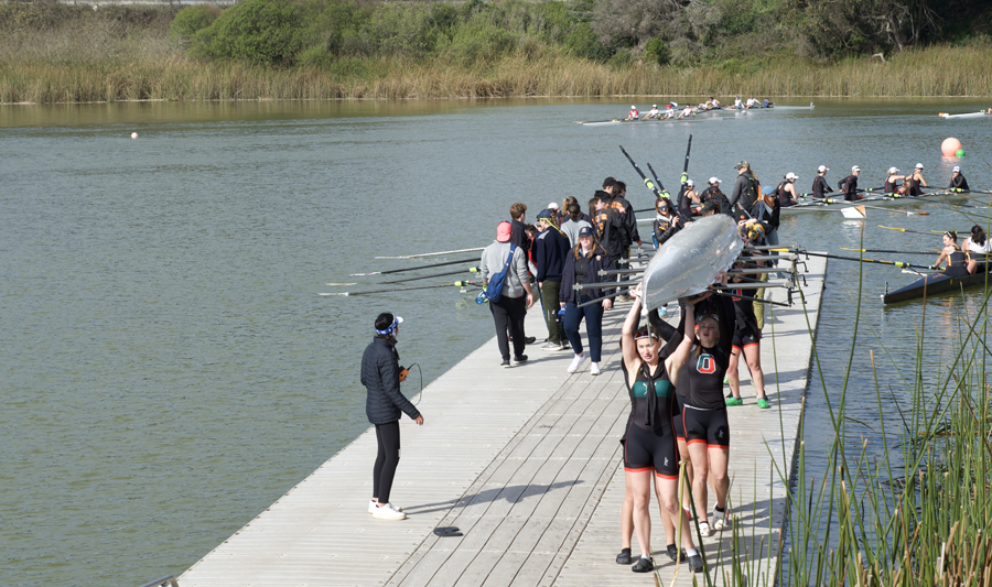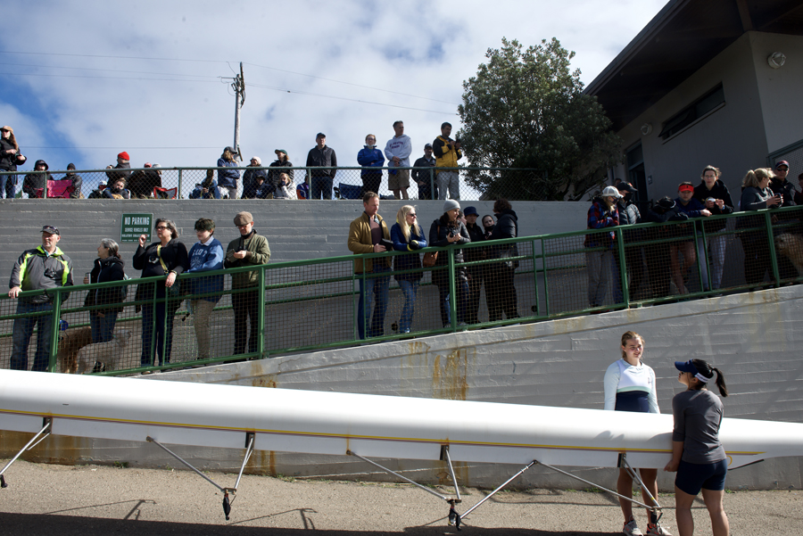 What looked like chaos was actually carefully timed precision that allowed rowers to carry their boats and oars from the staging area across Harding Road, down a steep driveway, and onto the narrow docks on Lake Merced. As the dockmaster directed crews in and out of the launch area, crews carried boats on their shoulders, walked backward and tipped boats on their sides to fit through the narrow gates at the dock while taking care not to hit onlookers with riggers.