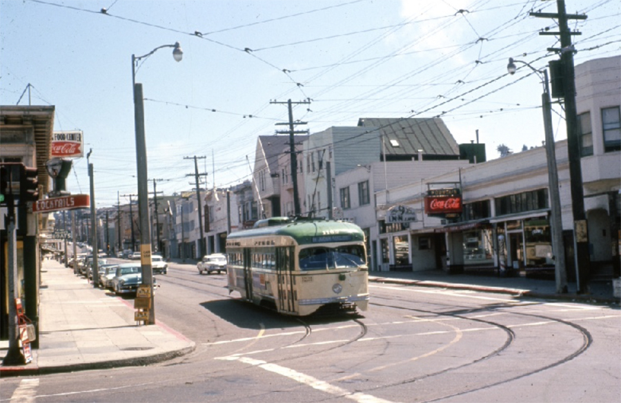 Above: View south down Ninth Avenue at Irving Street in 1964. An inbound N-Judah streetcar is about to make a right turn onto Irving. Visible are Mac’s Place (The Stein), 9th Inning bar, donut shop and ice cream fountain, and Frank’s barber shop. Photo courtesy of a private collector/Western Neighborhoods Project/OpenSFHistory.