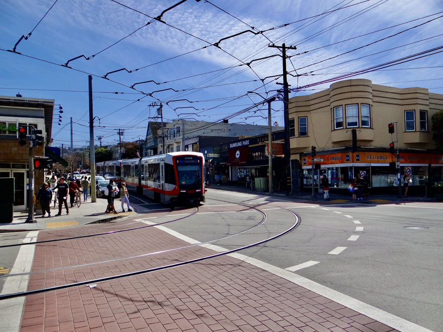 Below: The same view down Ninth Avenue with a modern-day two-car Muni streetcar. This photo was taken on March 2, 2022. Photo by Michael Durand.