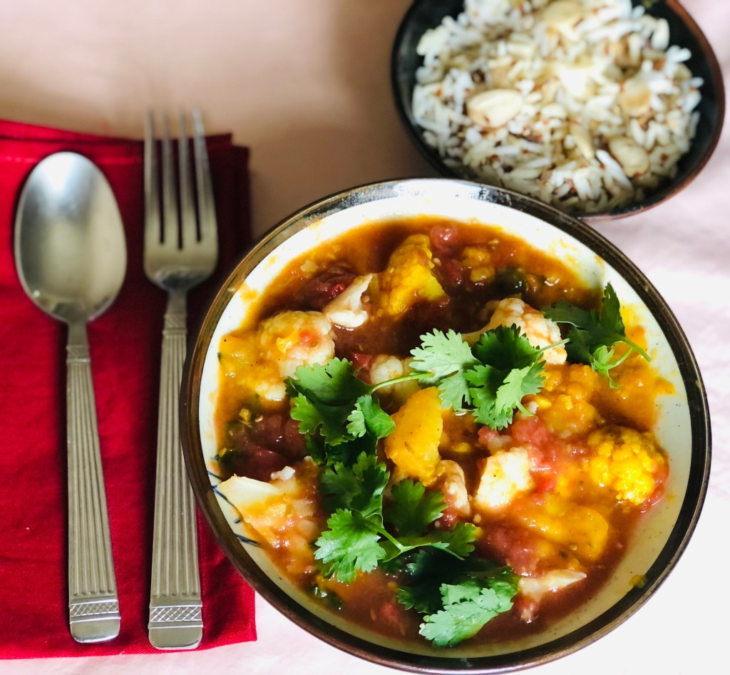 To finalize the recipe, heat 3 tablespoon of oil in a saucepan and add the garlic and cumin seeds. Add the potatoes and cauliflower pieces. Stir fry them for 4 to 5 minutes so that the pieces are well coated with oil. Add the tomato sauce and stir the mixture gently with a wooden spoon. Next, cover and simmer the bhaji gently at a low temperature for 5 minutes. Then add the water and cook for additional 10 minutes until the potatoes are soft. Taste to correct spiciness and add more garam masala and/or cayenne and salt, only if needed. When the vegetables are soft and a thick sauce has been formed, the dish is ready to be served. Garnish the dish with chopped cilantro and serve with rice and/or bread.