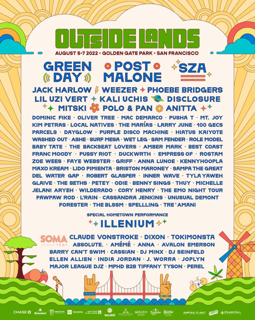 Today Another Planet Entertainment, Superfly and Starr Hill Presents are thrilled to announce the 2022 festival lineup. Headliners include hometown pop-punk dynamo Green Day as well as rapper, singer, and songwriter Post Malone and recent GRAMMY winner SZA. The lineup is as dynamic and fruitful as ever with a perfect mix of genres and artists from all over the world. Household names like Weezer, Jack Harlow, Phoebe Bridgers,Illenium, Lil Uzi Vert, Kali Uchis, Disclosure, Mitski and more will be joined by some of the best new talent as well as fan favorites, including Anitta, Polo & Pan, Pusha T, Dominic Fike, Mac DeMarco, 100 Gecs, Kim Petras, Parcels, Wet Leg, Washed Out, and more. With more than 90 artists on the 2022 lineup, there really is something for everyone, confirming why Outside Lands is one of the best festivals in the world for music discovery.