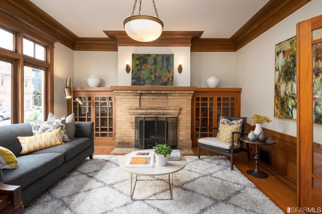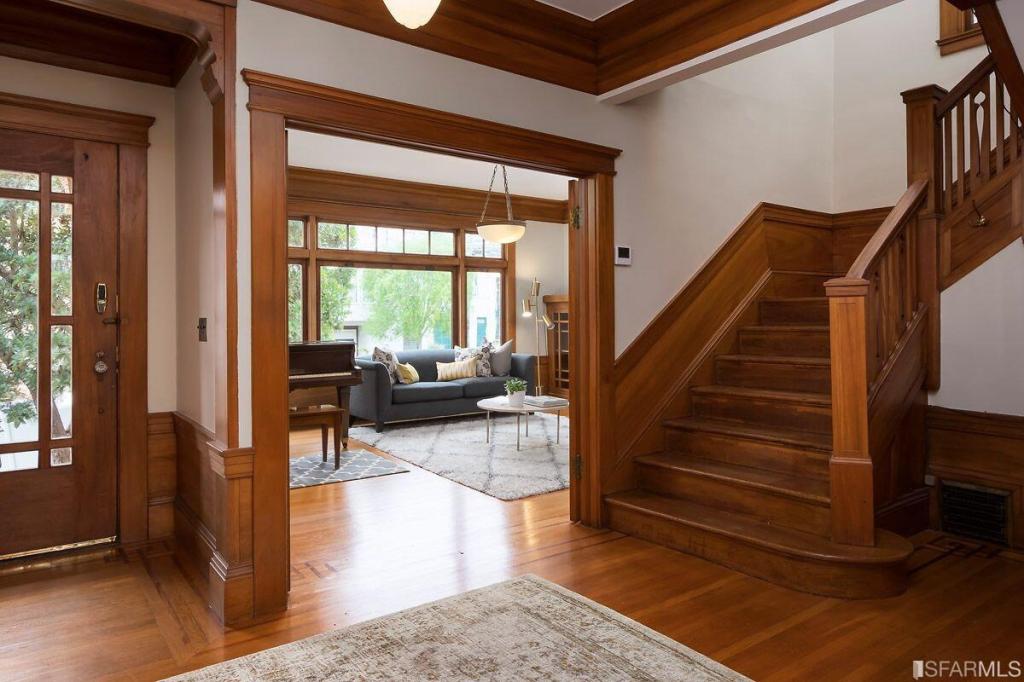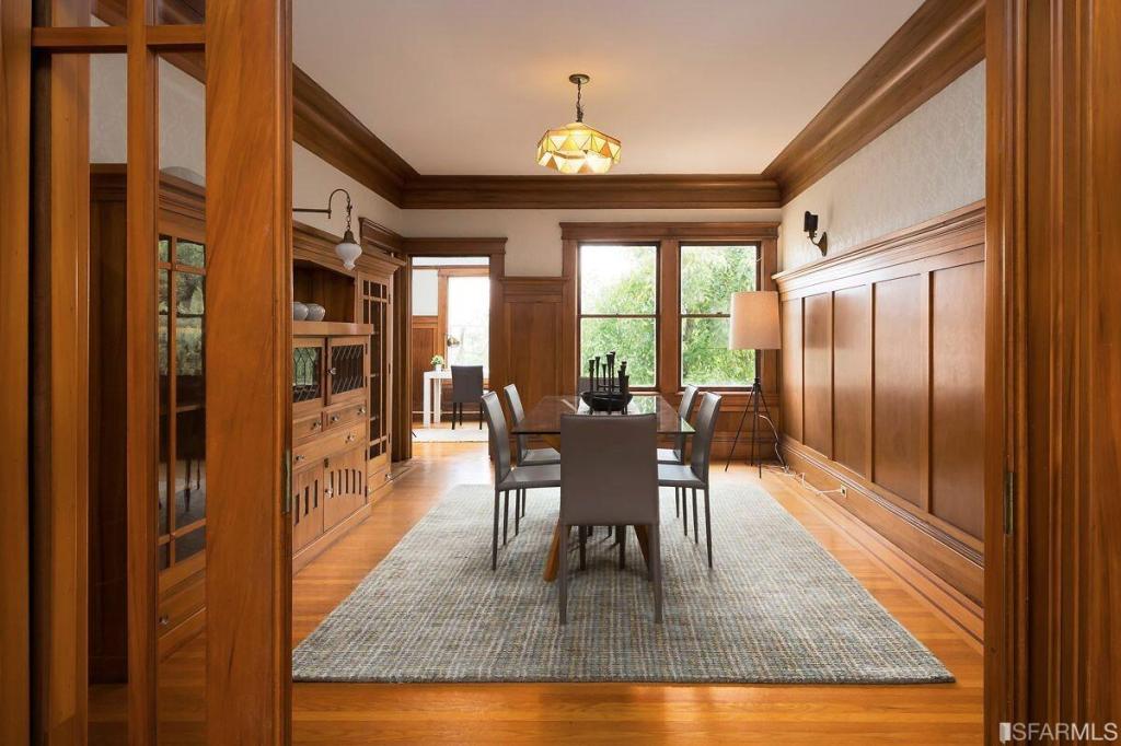 Previously, this Edwardian was three beds, two baths, about 2,300 square feet, and, critically, orange on the outside. The interiors emphasized A LOT of warm brown woodwork in virtually every room. We’re borrowing some photos from the old listing for illustrative purposes: