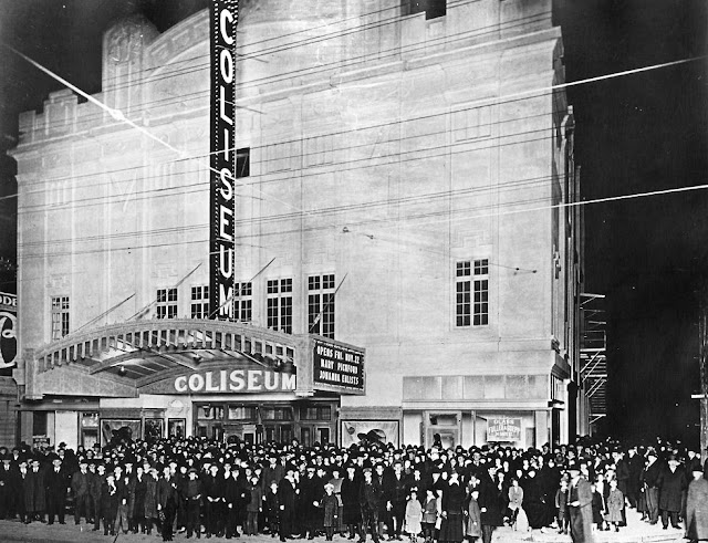 The Coliseum opened its doors in late November of 1918, screening a sentimental rom-com set in World War I, a war which actually ended only about a week earlier–hence the San Francisco Chronicle reported at the time that all the proceeds from opening night went to the Red Cross.