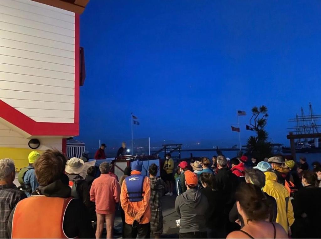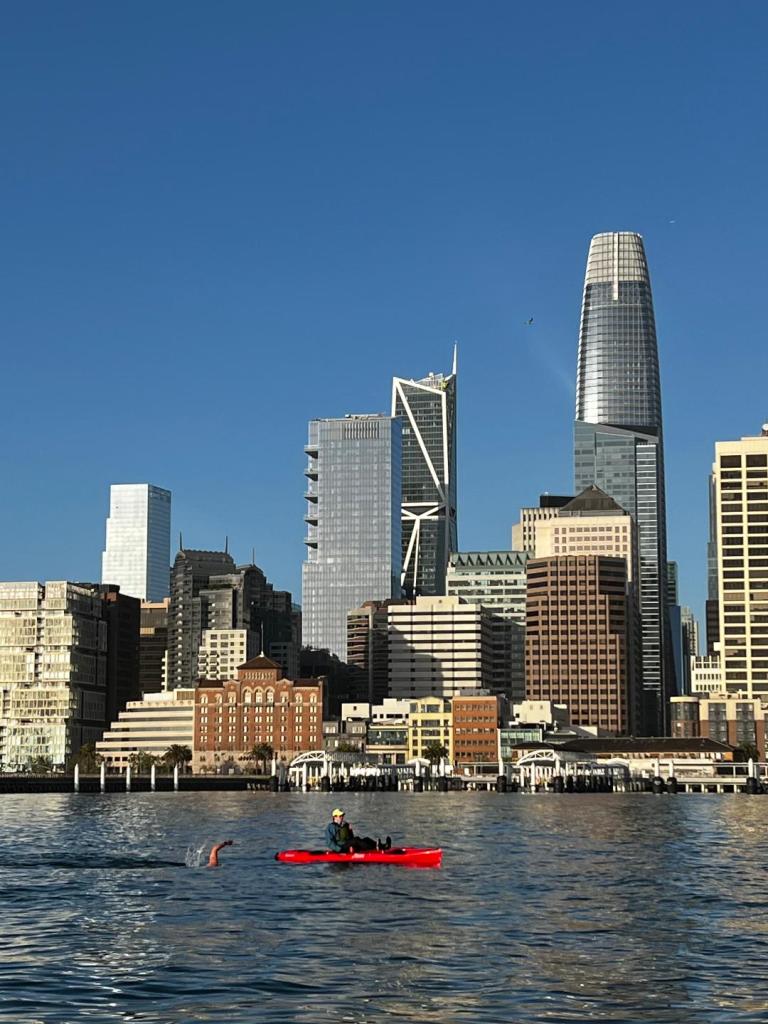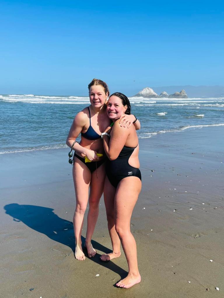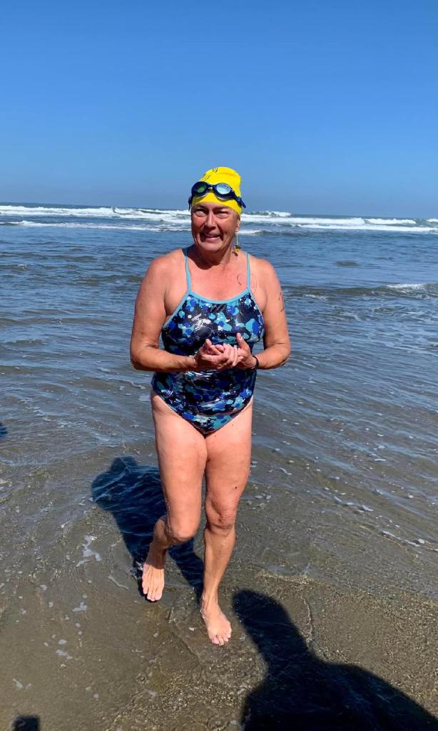 During the May 22 swim, the swells rolled to heights of 10 feet, eclipsing kayakers and support boats. It’s an epic task keeping everyone together and safe. Each swimmer is escorted by a dedicated kayaker who stays alongside and guides them. Outside the Gate, they navigate toward Mile Rock where they make a sharp left turn toward Seal Rocks and Ocean Beach. The water is still moving west, so it’s a difficult task staying on line. Once they pass Seal Rocks, swimmers check in with a support boat and are cleared to swim to shore through the breakers. On land they are greeted by hoards of volunteers with warm water, clothes and a ride back to the Club.