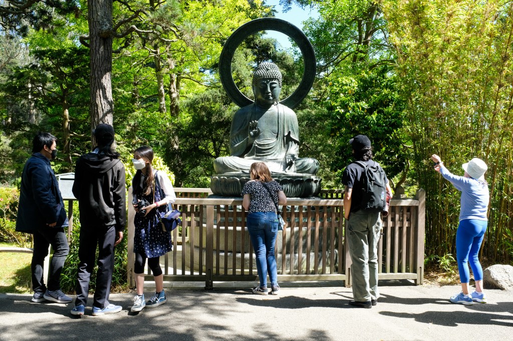 The Buddha statue is in the Japanese Tea Garden in the west part of the Music Concourse in Golden Gate Park. Admission to the Garden is free with proof of San Francisco residency. The Garden is open from 9 a.m. to 6 p.m. during the summer.