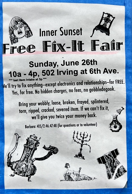 The flier advertising the Inner Sunset Free Fix-It Fair said it all: “We’ll try to fix anything – except electronics and relationships – for FREE. Bring your wobbly, loose, broken, frayed, splintered, torn, ripped, cracked severed item. If we can’t fix it, we’ll give you twice your money back.”