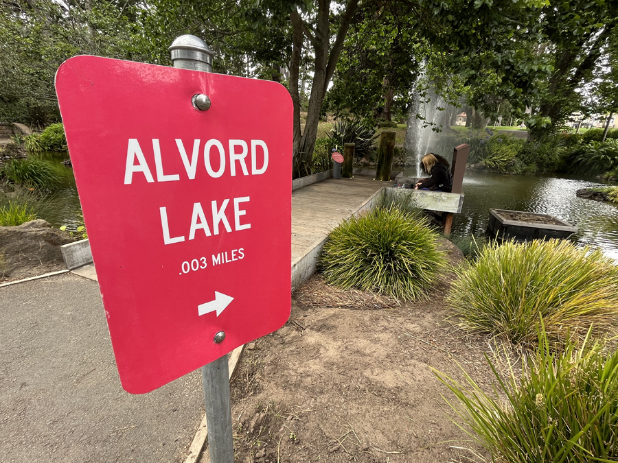 Alvord Lake is 200 feet west of an entrance to the Park at Stanyan and Haight streets. A few yards west of the lake is the Alvord Lake Bridge. The pedestrian tunnel underneath Alvord Lake Bridge is easiest to find from Alvord Lake; some trails from other directions lead walkers to the top of the bridge where there is no designated pedestrian crosswalk across busy Kezar Drive.