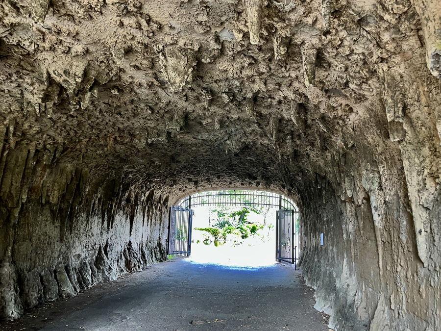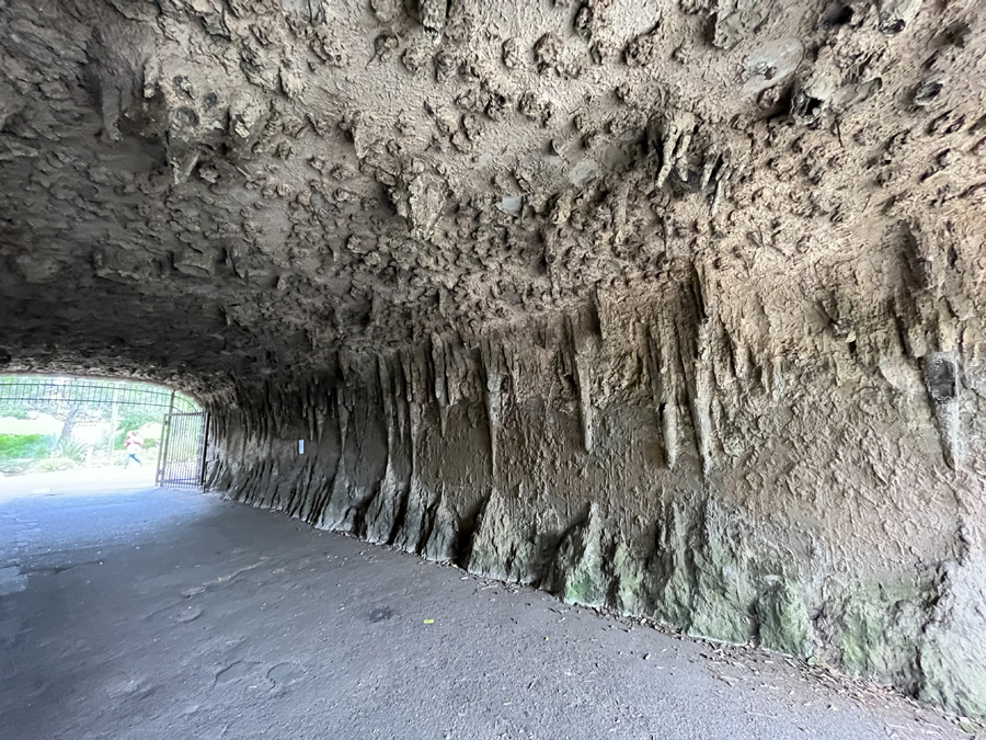 Alvord Lake Bridge is a single arch, 64 feet wide with a 29-foot-long span. Built in 1889, it is the oldest known reinforced concrete bridge built in the United States. The bridge’s concrete was reinforced by Ransome with square steel bars twisted “cold,” at room temperature while the steel is solid, not molten. Ransome wrote about how he twisted two-inch rods using manual power by modifying the crank mechanism in one of his cement mixers. The bars were bent following the curve of the arch and embedded, helping the bridge survive the 1906 earthquake. The bridge is part of a split-level crossing; road traffic crosses the bridge from north to south (and back) over a west-east pedestrian tunnel letting park visitors walk between the Haight Street park entrance and the Children’s Playground. The stalactites hanging from the pedestrian tunnel ceiling are artificial, maybe to simulate a cave, according to Daniel L. Schodek, a late faculty member of Harvard’s Graduate School of Design.