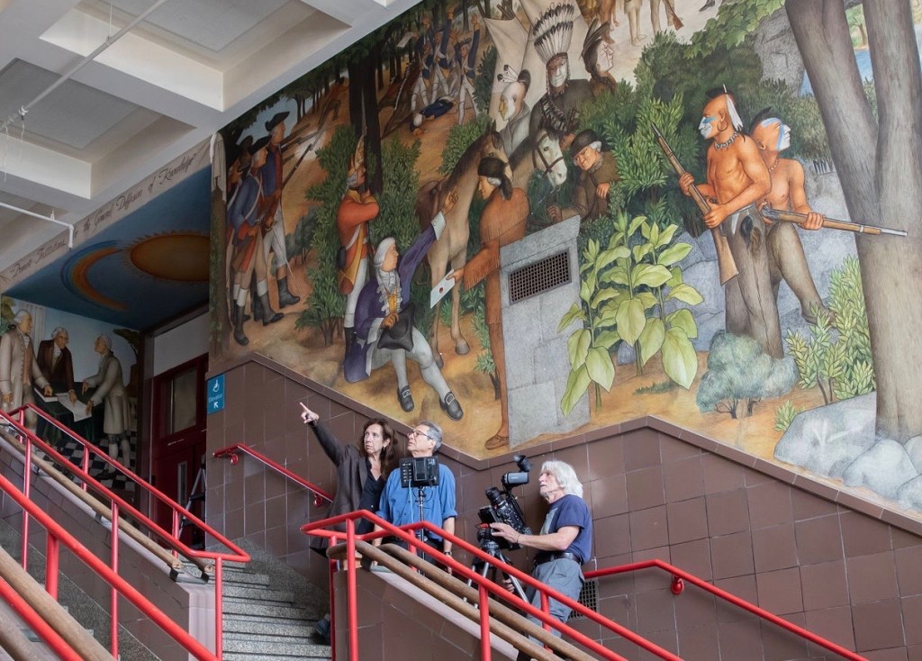The film opens with one of three 2019 school board meetings focusing on the issue of what to do with the murals. It was well attended by the public. Snitow and Kaufman captured the heated arguments and tearful pleas of parents who believe the students were being traumatized by the imagery.
