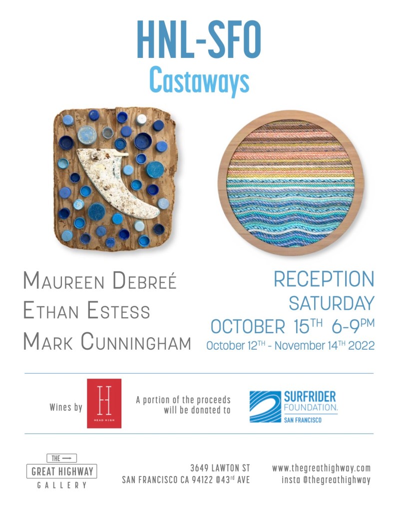 The Great Highway gallery is excited to present HNL-SFO/Castaways, Installation, rope panels and assemblage from Maureen Debreé, Ethan Estess and Mark Cunningham. Sponsored by Head High wines. A portion of the proceeds from the exhibit will be donated to the San Francisco Surfrider Foundation – sf.surfrider.org/.