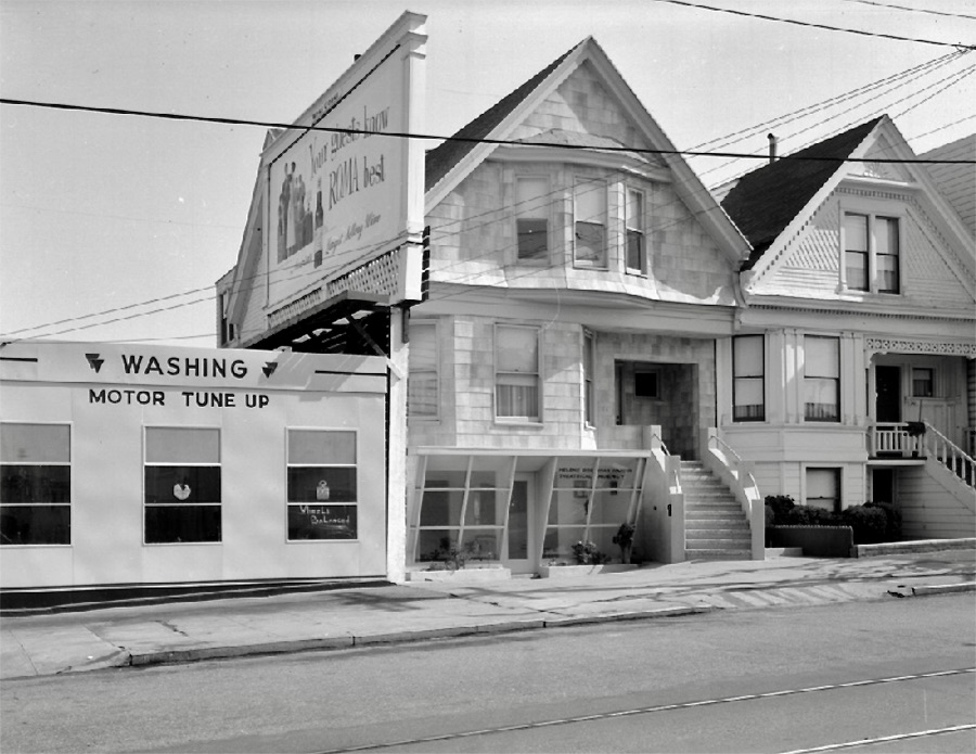 Above: The two homes and the gas station on the corner of Second Avenue and Balboa Street have all been demolished for apartment buildings. In 1951, the basement of 26 Balboa St., center, housed the Helene Hardin Theatrical Talent Agency. Photo courtesy of a private collector/Western Neighborhoods Project/OpenSFHistory.