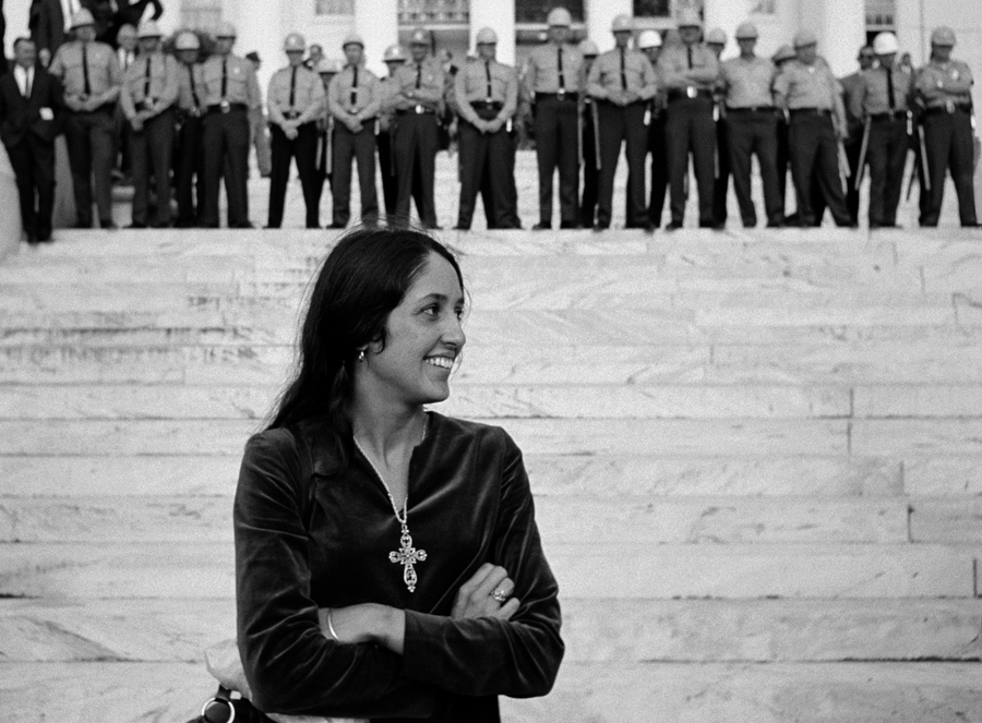 When he turned, he saw folk singer Joan Baez (in her 20s at the time), waiting at the bottom of the stairs of the State House for her turn to perform on stage. At the top of the stairs was a line of armed state troopers. He took the shot. Somerstein sold this photo to the New York Times Magazine, but all the rest went into his personal archive as he graduated and began his career as a physicist.