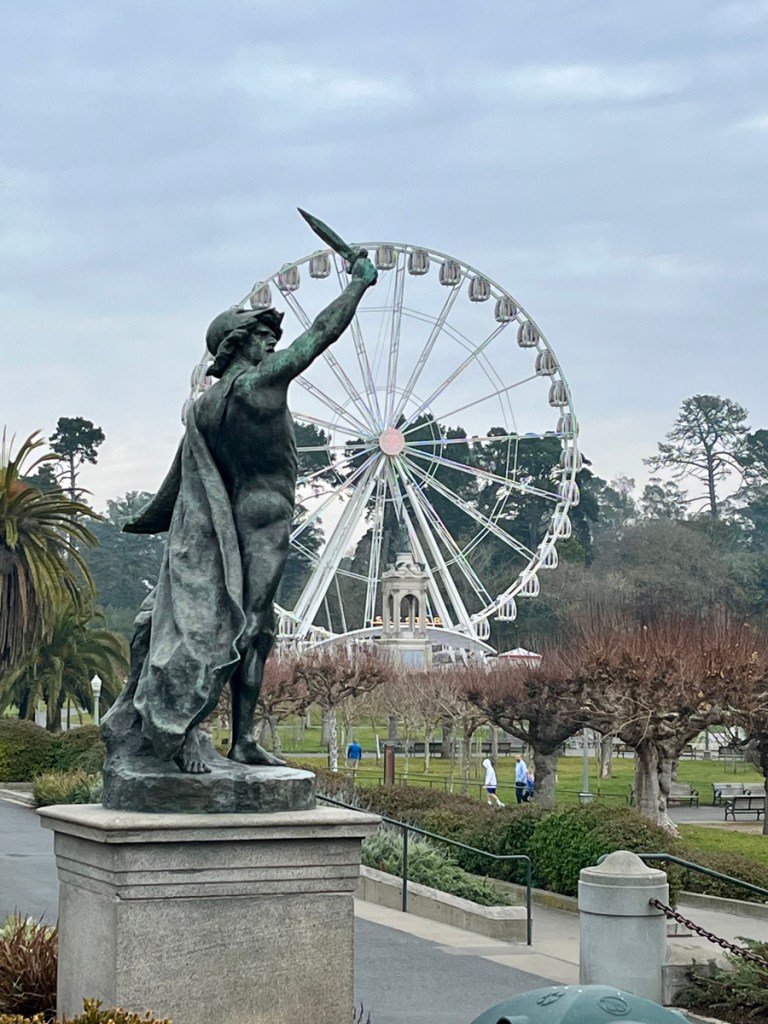 The sculpture is on the northern part of the Music Concourse, across the street from the de Young Museum.