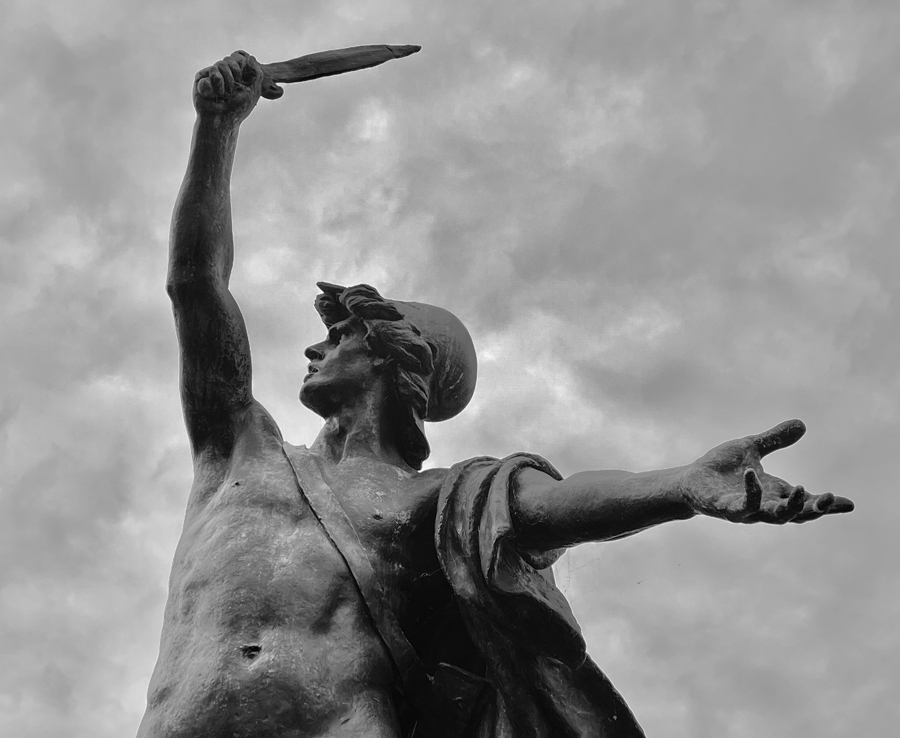 While the statue today is referred to as the Roman Gladiator Sculpture on the Golden Gate Park 150th anniversary website, an 1880 Belgian catalog uses a different French description: “Léonidas aux Thermopyles, exhortant ses soldats au combat,” or “Leonidas at Thermopylae exhorting his troops to battle.” Also, Lipsky referred to the statue as part of the Exposition’s “Fair of King Leonidas of Sparta.” The statue depicts King Leonidas from the ancient Greek city state of Sparta. Leonidas is famous for holding out with his 300 Spartan soldiers during a heroic last stand to defend the narrow pass of Thermopylae against a much larger invading Persian force in the year 480 BCE for a few days before succumbing to the Persians. (Ancient Greek sources mention several hundred other Greek soldiers defending the pass at various stages of the battle before being dismissed by Leonidas or surrendering to the Persians, according to Michael A. Flower’s article “Simonides, Ephorus, and Herodotus on the Battle of Thermopylae.”)