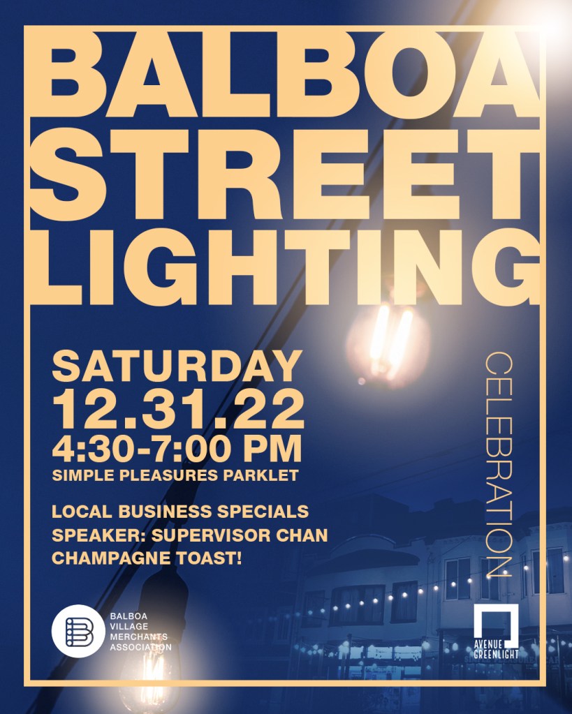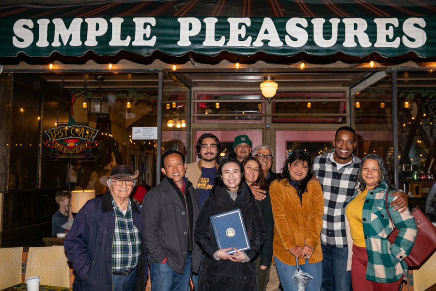 (Left to right) Henry Karnilowicz, David Chu, Gio Riggio, Connie Chan, Eric Lindsey, Dianna Riggio Riad, Ahmed Riad, Marjan Philhour, Mo Brooks (DJ Coco Leche), and Suzie Ferras. Balboa Street Lighting Celebration. Photo by Tyrone Bartoli.