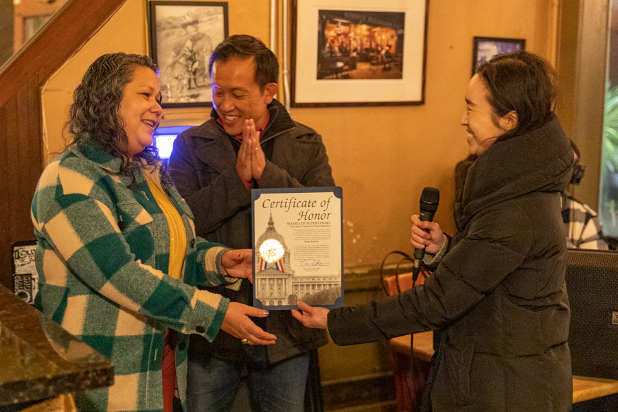 David Chu applauds as Connie Chu presents Suzie Ferras a Certificate of Honor for her work on the Balboa Street Lighting project. Photo by Tyrone Bartoli. Instagram: @tyronebartoli.