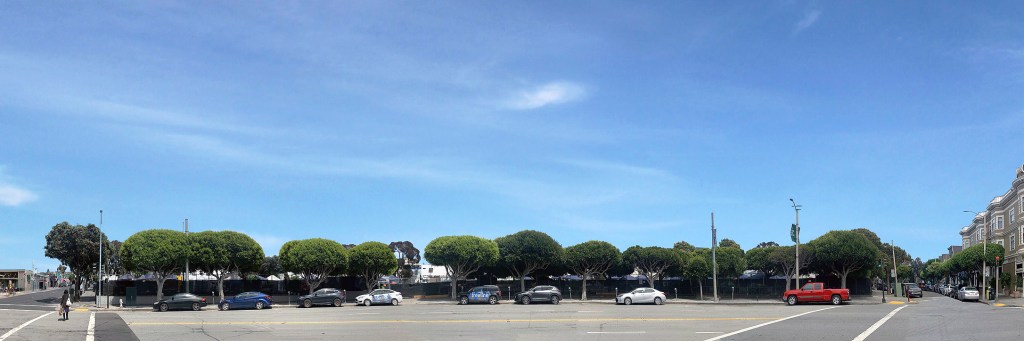 Below: A view of the property before construction. The street in the foreground is Stanyan, Haight Street is to the left, Waller Street is on the right.