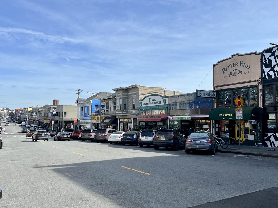 Right: This recent photo shows the architecture of the neighborhood has not changed much, except the building on the southeast corner of Clement and Fifth has lost its Victorian facade. The streetcar and the rails are gone, and the design of the old cars has been replaced with sleeker, if less romantic, designs. The building at the far right, (A.E. Harris Wines and Liquors) which sold alcoholic beverages 80 years ago, is still in the business of selling alcohol, now as the Bitter End bar. The tower at Roosevelt is still visible, but the school is now called Roosevelt Middle School. Photo by Michael Durand.