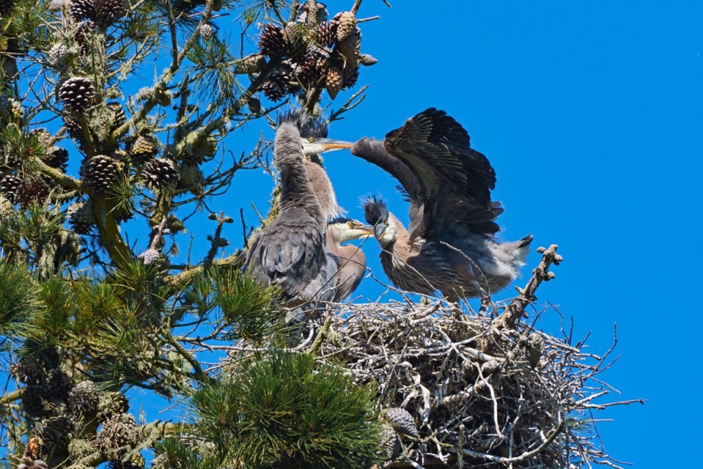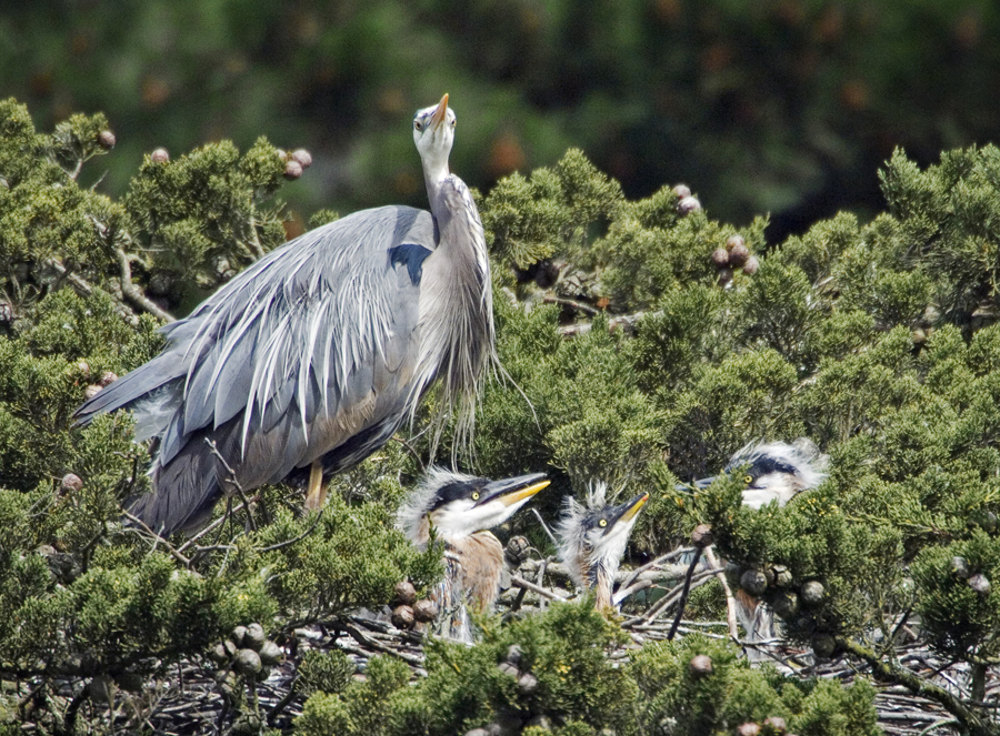 Herons are charismatic birds; their courtship rituals are elaborate and beautiful. The chicks closely resemble little dinosaurs with their punk mohawks.